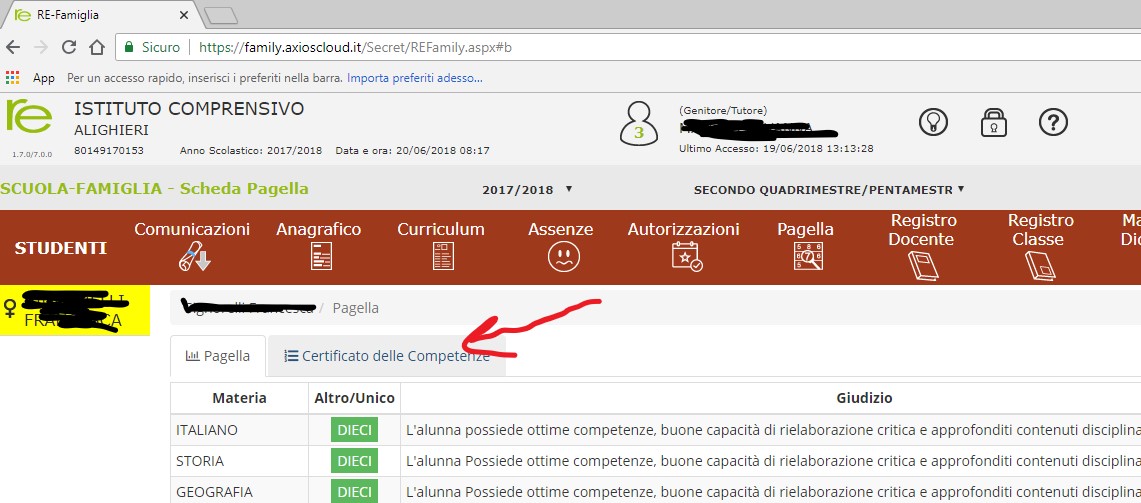 - Le pagelle possono essere visualizzate tramite R.E., come per il 1° periodo, con la differenza che per ogni materia si vedranno, oltre alle valutazioni, anche i giudizi. Gli incontri si svolgeranno esattamente come l’anno scorso con la differenza che la pagella sarà commentata, ma non consegnata. Entrando a visualizzare la pagella, si troverà la possibilità di visualizzare anche la certificazione delle competenze (v. freccia rossa).schermata.jpg